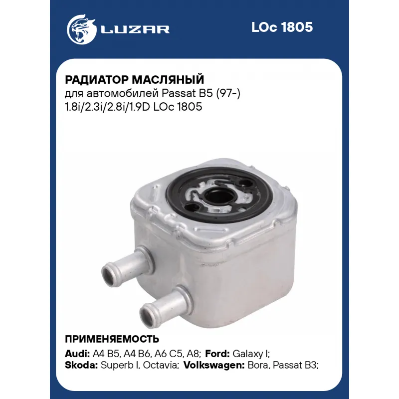 Радиатор масляный для автомобилей Passat B5 (97-) 1.8i/2.3i/2.8i/1.9D Характеристики: Артикул: LOc 1805 OEM номера: 028.117.021 C, 028 117 021E, 028 117 021H, 028117021D, 028117021 Материал: алюминий Тип радиатора: масло-жидкость Трансмиссия: MT/AT Габариты изделия, мм: 130*99*73 Кондиционер: +/- Сопутствующий товар: Радиаторы охлаждения: LRc 1812; LRc 18J0 Комплектация:: уплонительная прокладка в комплекте Подходит для авто: Audi A4 B5 (94-), A4 B6 (00-), A6 C5 (97-), A8 (03-) Ford Galaxy I (95-) Skoda Superb I (01-), Octavia (96-) Volkswagen Bora (99-), Passat B3 (88-), Passat B4 (93-), Passat B5 (96-), Passat B5 (96-), Passat CC (08-), Sharan (95-), Bora (99-), Golf IV (97-), Transporter T5 (03-) Для проверки применяемости отправьте VIN автомобиля через вкладку "Есть вопросы о товаре?" Комплектация: Радиатор масляный Паспорт изделия Уплонительная прокладка Гарантия: от 1 года.