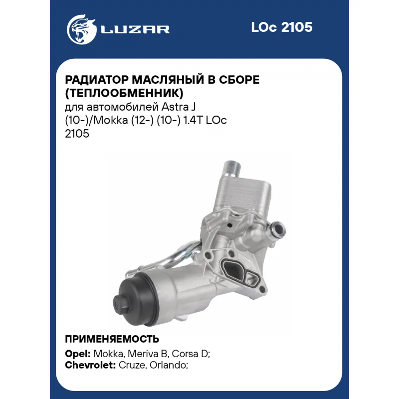 Радиатор масляный в сборе (теплообменник) для автомобилей Astra J (10-)/Mokka (12-) (10-) 1.4T Характеристики: Артикул: LOc 2105 OEM номера: 55566784, 650039 Материал: алюминий Трансмиссия: MT/AT Кондиционер: +/- Тип радиатора: масло-жидкость Габариты изделия, мм: 267*190*206 Сопутствующий товар: Радиаторы охлаждения: LRc 2116 Сопутствующий товар: Радиаторы интеркулера (онв): LRIC 21131 Подходит для авто: Opel Mokka (13-), Meriva B (10-), Corsa D (06-), Zafira C (11-), Astra J (10-), Insignia (08-) Chevrolet Cruze (09-), Orlando (10-) Для проверки применяемости отправьте VIN автомобиля через вкладку "Есть вопросы о товаре?" Комплектация: Радиатор масляный в сборе с корпусом - 1 шт Уплотнительные прокладки - 2 шт Паспорт изделия - 1 шт Гарантия: от 1 года.