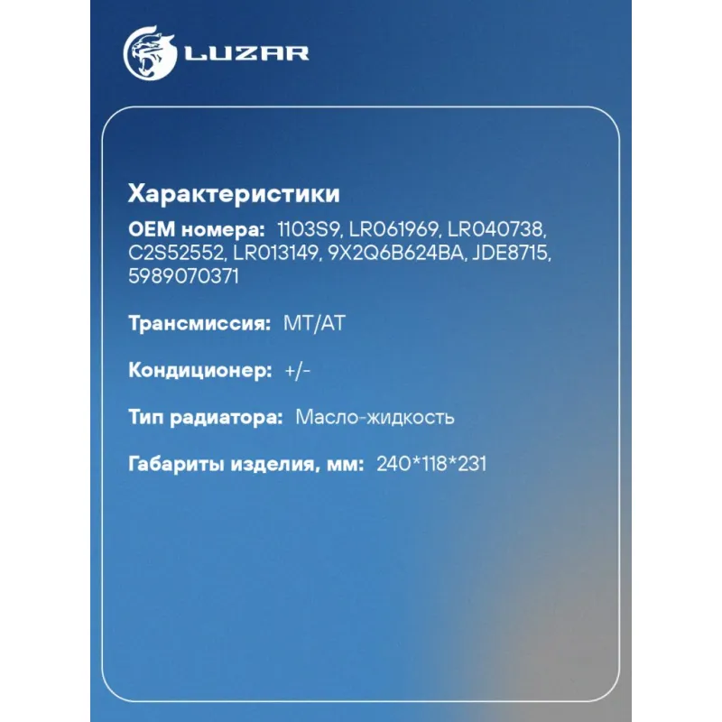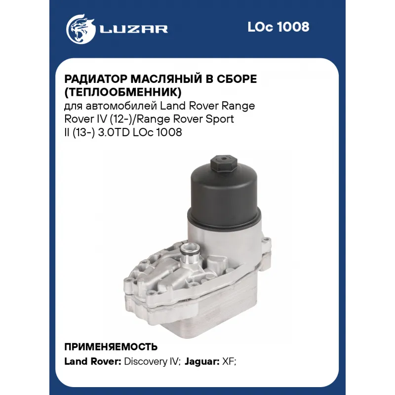 Радиатор масляный в сборе (теплообменник) для автомобилей Land Rover Range Rover IV (12-)/Range Rover Sport II (13-) 3.0TD Характеристики: Артикул: LOc 1008 OEM номера: 1103S9, LR061969, LR040738, C2S52552, LR013149, 9X2Q6B624BA, JDE8715, 5989070371 Материал: алюминий Трансмиссия: MT/AT Кондиционер: +/- Тип радиатора: масло-жидкость Габариты изделия, мм: 240*118*231 Подходит для авто: Land Rover Discovery IV (09-), Range Rover Sport II (13-), Range Rover IV (12-), Range Rover Sport I (05-) Jaguar XF (07-) Для проверки применяемости отправьте VIN автомобиля через вкладку "Есть вопросы о товаре?" Комплектация: Радиатор масляный в сборе с корпусом - 1 шт Паспорт изделия - 1 шт Гарантия: от 1 года.
