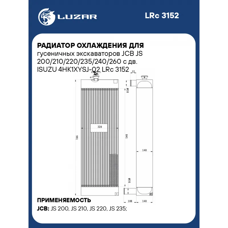 Радиатор охлаждения для гусеничных экскаваторов JCB JS 200/210/220/235/240/260 с дв. ISUZU 4HK1XYSJ-02 Характеристики: Артикул: LRc 3152 OEM номера: 30/927082 Трансмиссия: MT/AT Кондиционер: +/- Длина сердцевины, мм: 320 Высота сердцевины, мм: 841 Толщина сердцевины, мм: 140 Тип сердцевины: паяная, 2-х рядная Материал сердцевины: Алюминий Материал бачков: Алюминий Подходит для авто: JCB JS 200, JS 210, JS 220, JS 235, JS 240, JS 260 Для проверки применяемости отправьте VIN автомобиля через вкладку "Есть вопросы о товаре?" Комплектация: Радиатор охлаждения Крышка радиатора Паспорт изделия Гарантия: от 1 года.