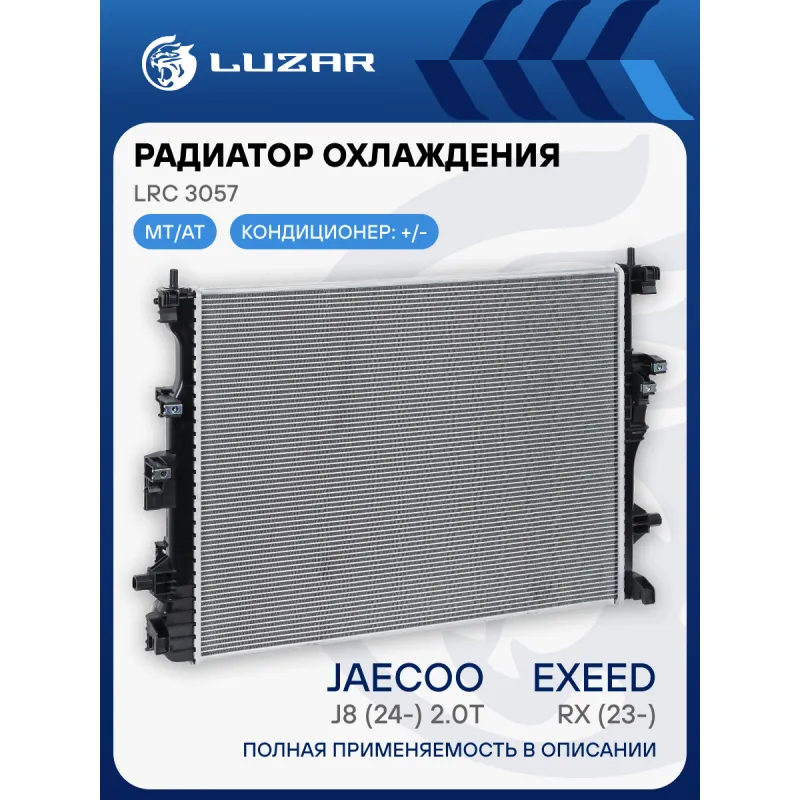 Радиатор охлаждения для а/м Exeed RX (23-)/Jaecoo J8 (24-) 2.0T Характеристики: Артикул: LRc 3057 OEM номера: 302000797AA Трансмиссия: MT/AT Кондиционер: +/- Длина сердцевины, мм: 650 Высота сердцевины, мм: 519 Толщина сердцевины, мм: 20 Тип сердцевины: паяная Материал сердцевины: алюминий Материал бачков: пластик Подходит для... Читать полностью →