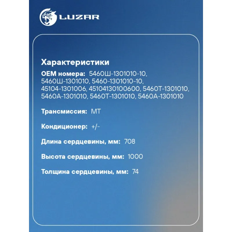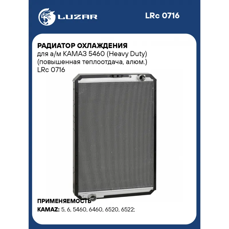 Радиатор охлаждения для а/м КАМАЗ 5460 (Heavy Duty) (повышенная теплоотдача, алюм.) Характеристики: Артикул: LRc 0716 OEM номера: 5460Ш-1301010-10, 5460Ш-1301010, 5460-1301010-10, 45104-1301006, 45104130100600, 5460Т-1301010, 5460А-1301010, 5460T-1301010, 5460A-1301010, 5460-1301010 Сопутствующий товар:: LRc 07601 Трансмиссия: MT Кондиционер: +/- Длина сердцевины, мм: 708 Высота сердцевины, мм: 1000 Толщина сердцевины, мм: 74 Тип сердцевины: паяная, 3-х рядная Материал сердцевины: алюминий Материал бачков: алюминий Сопутствующий товар: Радиаторы кондиционера (конденсеры): LRAC 15703 Сопутствующий товар: Патрубки охлаждения (комплект): LPK 0720 Тип конструкции: с металлической рамой Примечание: ширина трубок сердцевины 22мм Аналог: аналог LRc 07601, но с увеличенной толщиной сердцевины Комплектация: Радиатор охлаждения - 1 шт Паспорт изделия - 1 шт Гарантия: от 1 года.