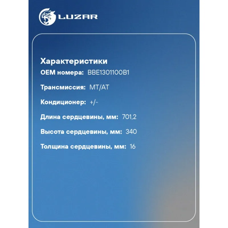 Радиатор охлаждения для а/м Lifan Solano II (16-) 1.5i Характеристики: Артикул: LRc 3032 OEM номера: BBE1301100B1 Трансмиссия: MT/AT Кондиционер: +/- Материал сердцевины: алюминий Материал бачков: пластик Тип сердцевины: паяная Сопутствующий товар: Крышки (пробки) радиатора: LL 1905 Сопутствующий товар: Электровентиляторы охлаждения: LFK 3016 Длина сердцевины, мм: 701,2 Толщина сердцевины, мм: 16 Высота сердцевины, мм: 340 Комплектация: Радиатор охлаждения Паспорт изделия Гарантия: от 1 года.
