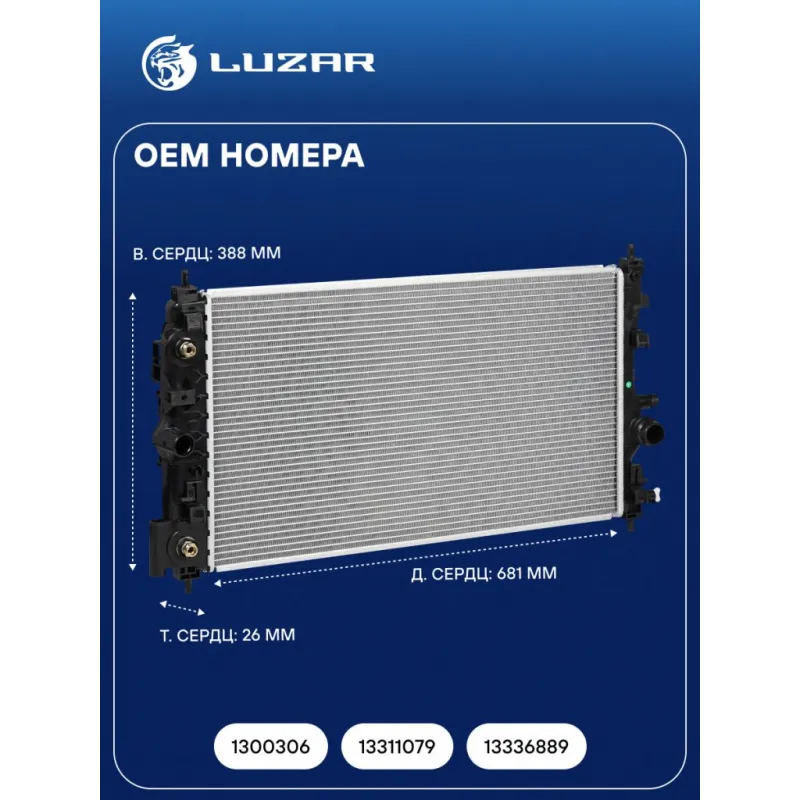 Радиатор охлаждения для автомобилей Astra J (10-)/Сhevrolet Cruze (09-) Turbo Характеристики: Артикул: LRc 21106 OEM номера: 1300306, 13311079, 13336889 Сопутствующий товар: Патрубки охлаждения (комплект): LPK 2101, LPK 2102, LPK 2103, LPK 2104, LPK 2105 Трансмиссия: AT Кондиционер: +/- Длина сердцевины, мм: 681 Высота сердцевины, мм: 388 Толщина сердцевины, мм: 26 Сопутствующий товар: Электровентиляторы охлаждения: LFc 0550; LFc 0551; LFK 0550; LFK 21106 Сопутствующий товар: Радиаторы кондиционера (конденсеры): LRAC 0550; LRAC 0552 Сопутствующий товар: Крышки (пробки) расширительного бачка: LL 0548 Подходит для авто: Opel Zafira C (11-), Astra J (10-) Chevrolet Orlando (10-), Cruze (09-) Для проверки применяемости отправьте VIN автомобиля через вкладку "Есть вопросы о товаре?" Комплектация: Радиатор охлаждения Паспорт изделия Гарантия: от 1 года.