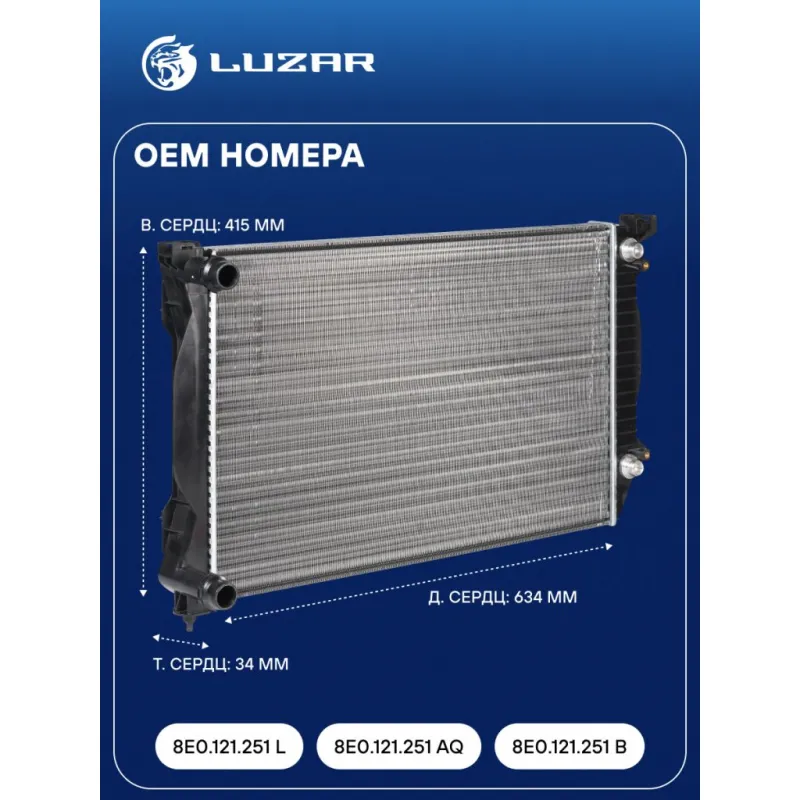 Радиатор охлаждения для а/м Audi A4 (00-)/(04-) 1.6i/1.8T/1.9TD/2.0i/2.0T/2.0TD Характеристики: Артикул: LRc 1816 OEM номера: 8E0.121.251 L, 8E0.121.251 AQ, 8E0.121.251 B Сопутствующий товар: Элементы для уплотнения соединений: LGS 0032 Трансмиссия: MT/AT Кондиционер: +/- Длина сердцевины, мм: 634 Высота сердцевины, мм: 415 Толщина сердцевины, мм: 34 Тип сердцевины: сборная Материал сердцевины: алюминий Материал бачков: пластик Подходит для авто: Audi A4 B6 (00-), A4 B7 (04-), A4 B7 (04-) Для проверки применяемости отправьте VIN автомобиля через вкладку "Есть вопросы о товаре?" Комплектация: Радиатор охлаждения Паспорт изделия Гарантия: от 1 года.