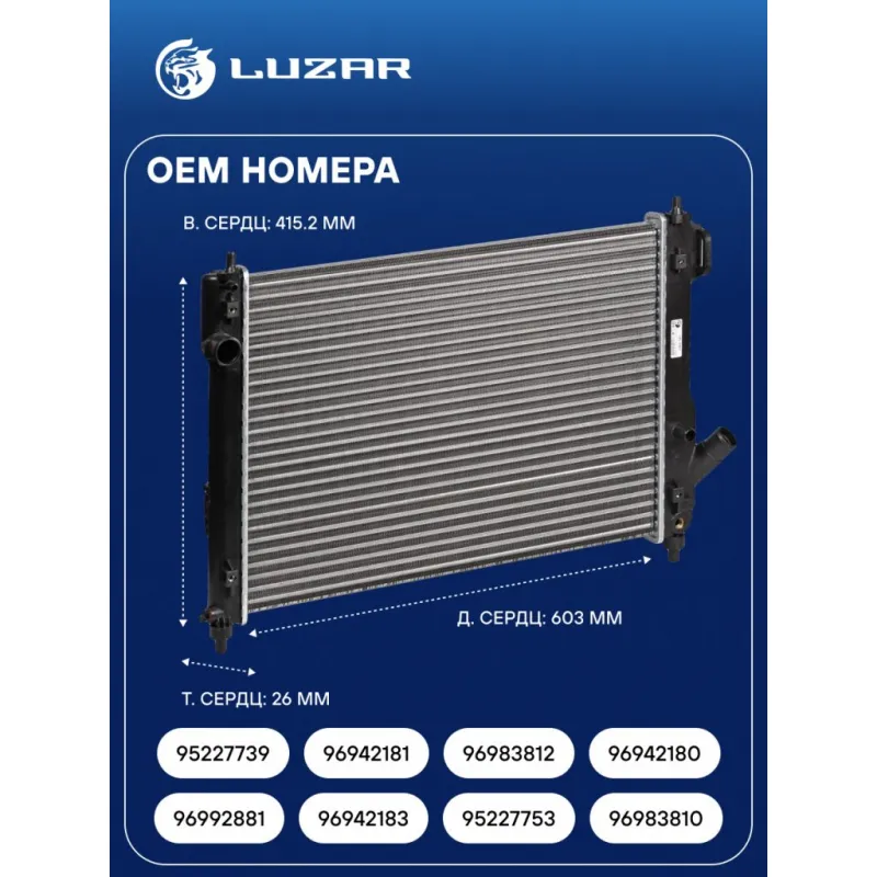 Радиатор охлаждения для автомобилей Aveo T255 (08-) 1.4i MT (сборный) Характеристики: Артикул: LRc 0581 OEM номера: 96992881, 96942183, 95227753, 95227739, 96942181, 96983812, 96942180, 96983810 Трансмиссия: MT Кондиционер: +/- Длина сердцевины, мм: 603 Высота сердцевины, мм: 415,2 Толщина сердцевины, мм: 26 Тип сердцевины: сборная Сопутствующий товар: Электровентиляторы кондиционера: LFAC 0520 Сопутствующий товар: Радиаторы кондиционера (конденсеры): LRAC 0581; LRAC 0589 Сопутствующий товар: Крышки (пробки) расширительного бачка: LL 0563 Сопутствующий товар: Бачки расширительные: LET 0581 Аналог: LRc 0504 (паяная сердцевина) Подходит для авто: Chevrolet Aveo T255 (08-), Aveo T250 (06-) ЗАЗ Vida (12-) Daewoo Gentra X (08-) Для проверки применяемости отправьте VIN автомобиля через вкладку "Есть вопросы о товаре?" Комплектация: Радиатор охлаждения Паспорт изделия Гарантия: от 1 года.
