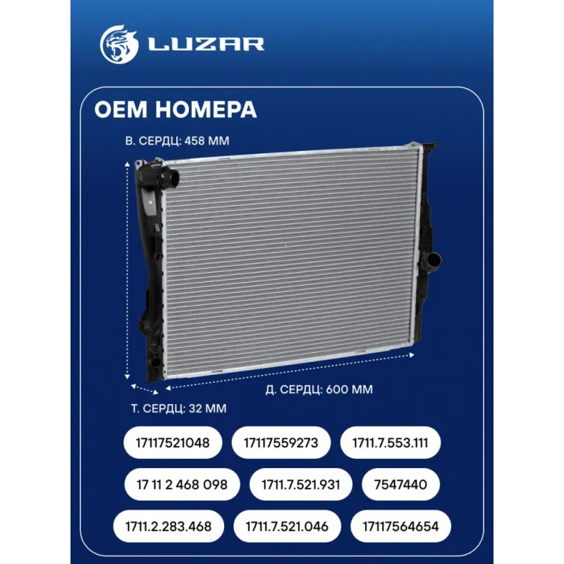 Радиатор охлаждения для автомобилей BMW 3 (E90/E91) (05-) G Характеристики: Артикул: LRc 26173 OEM номера: 17117521048, 17117559273, 1711.7.553.111, 1711.2.283.468, 1711.7.521.046, 17117564654, 17 11 2 468 098, 1711.7.521.931, 7547440 Сопутствующий товар: Элементы для уплотнения соединений: LGS 0024 Трансмиссия: MT/AT Кондиционер: +/- Длина сердцевины, мм: 600 Высота сердцевины, мм: 458 Толщина сердцевины, мм: 32 Тип сердцевины: паяная Материал сердцевины: алюминий Материал бачков: пластик Сопутствующий товар: Электровентиляторы охлаждения: LFK 26173 Сопутствующий товар: Радиаторы кондиционера (конденсеры): LRAC 26173 Комплектация:: короткая (для МКПП) и длинная нижняя пробка (для АТ) Подходит для авто: BMW 3 E90 (05-), 1 E81/E87 (04-), X1 E84 (09-) Для проверки применяемости отправьте VIN автомобиля через вкладку "Есть вопросы о товаре?" Комплектация: Радиатор охлаждения Паспорт изделия Пробка канала охлаждения КПП (короткая) Пробка канала охлаждения КПП (длинная) Гарантия: от 1 года.