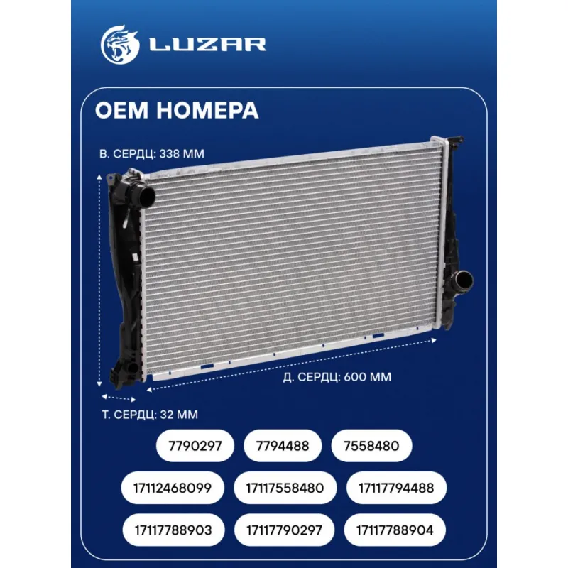 Радиатор охлаждения для автомобилей BMW 3 (E90/E91) (06-) D Характеристики: Артикул: LRc 26103 OEM номера: 17117788903, 17117790297, 17117788904, 17112468099, 17117558480, 17117794488, 7790297, 7794488, 7558480, 7788903 Трансмиссия: MT/AT Кондиционер: +/- Длина сердцевины, мм: 600 Высота сердцевины, мм: 338 Толщина сердцевины, мм: 32 Тип сердцевины: паяная Материал сердцевины: алюминий Материал бачков: пластик Комплектация:: Кран - 2 шт. (АТ/МТ) Подходит для авто: BMW 3 E90 (05-), 1 E81/E87 (04-) Для проверки применяемости отправьте VIN автомобиля через вкладку "Есть вопросы о товаре?" Комплектация: Радиатор охлаждения Паспорт изделия Пробка канала охлаждения КПП Уплотнительные кольца - 2 шт Гарантия: от 1 года.