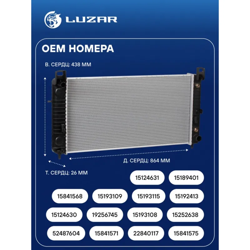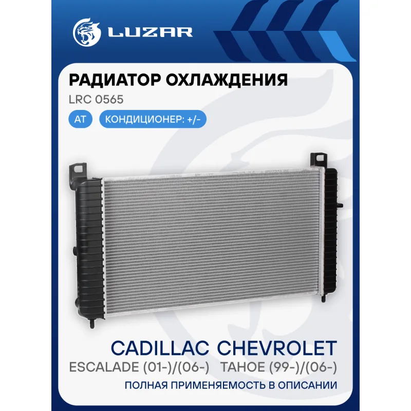 Радиатор охлаждения для автомобилей Cadillac Escalade (01-)/(06-)/Chevrolet Tahoe (99-)/(06-) AT Характеристики: Артикул: LRc 0565 OEM номера: 52487604, 15841571, 22840117, 15841575, 15124630, 19256745, 15193108, 15252638, 15841568, 15193109, 15193115, 15192413, 15124631, 15189401 Трансмиссия: AT Кондиционер: +/- Длина сердцевины, мм: 864 Высота сердцевины, мм: 438 Толщина сердцевины, мм: 26 Подходит для авто: Chevrolet Tahoe II (99-), Tahoe (06-) Hummer H2 (02-) Cadillac Escalade III (06-), Escalade II (01-) Для проверки применяемости отправьте VIN автомобиля через вкладку "Есть вопросы о товаре?" Комплектация: Радиатор охлаждения Паспорт изделия Гарантия: от 1 года.