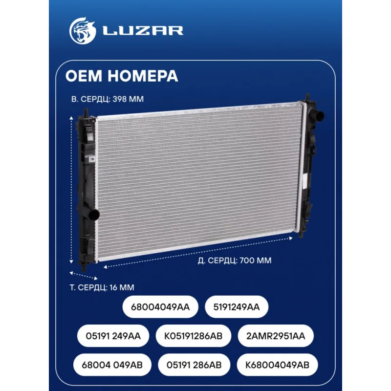 Радиатор охлаждения для а/м Dodge Caliber (06-) 1.8i/2.0i Характеристики: Артикул: LRc 0349 OEM номера: 68004 049AB, 05191 286AB, K68004049AB, 05191 249AA, K05191286AB, 2AMR2951AA, 68004049AA, 5191249AA Трансмиссия: MT/AT Кондиционер: + Длина сердцевины, мм: 700 Высота сердцевины, мм: 398 Толщина сердцевины, мм: 16 Сопутствующий товар: Радиаторы кондиционера (конденсеры): LRAC 0349 Подходит для авто: Dodge Caliber (07-), Avenger (07-) Jeep Compass (07-), Patriot (07-) Для проверки применяемости отправьте VIN автомобиля через вкладку "Есть вопросы о товаре?" Комплектация: Радиатор охлаждения Паспорт изделия Гарантия: от 1 года.