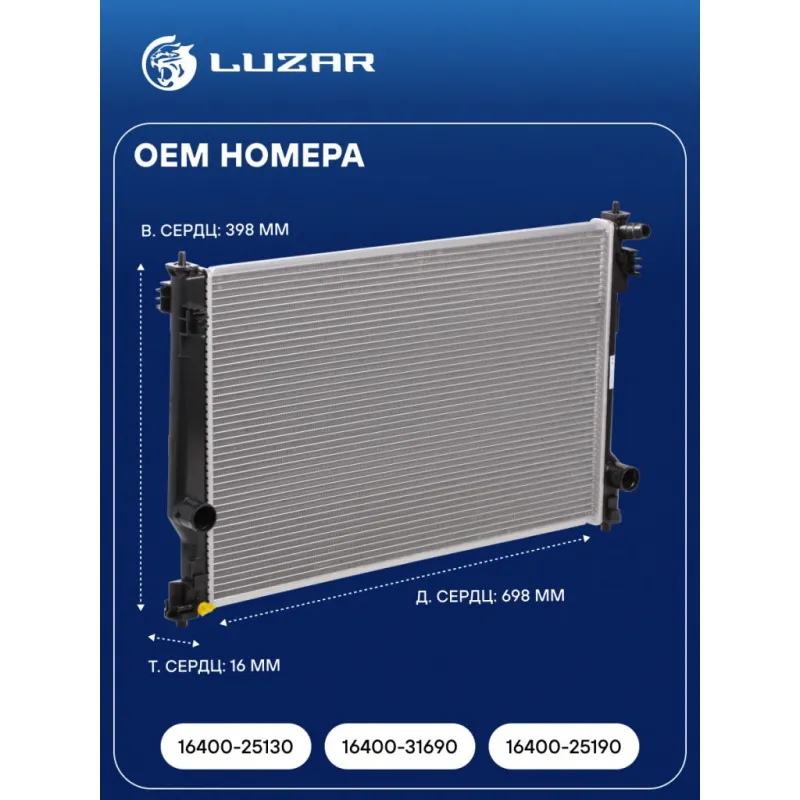 Радиатор охлаждения для автомобилей Camry (18-)/RAV4 (18-) 2.0i/2.5i AT Характеристики: Артикул: LRc 19141 OEM номера: 16400-25130, 16400-31690, 16400-25190 Трансмиссия: AT Кондиционер: + Длина сердцевины, мм: 698 Высота сердцевины, мм: 398 Толщина сердцевины, мм: 16 Подходит для авто: Toyota Camry (18-), RAV 4 (18-) Для проверки применяемости отправьте VIN автомобиля через вкладку "Есть вопросы о товаре?" Комплектация: Радиатор охлаждения Паспорт изделия Гарантия: от 1 года.