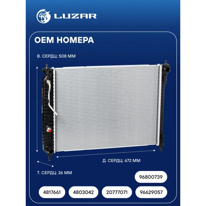 Радиатор охлаждения для автомобилей Captiva/Antara (06-) AT Характеристики: Артикул: LRc 05157 OEM номера: 4817661, 4803042, 20777071, 96629057, 96800739 Трансмиссия: AT Кондиционер: +/- Длина сердцевины, мм: 672 Высота сердцевины, мм: 508 Толщина сердцевины, мм: 26 Сопутствующий товар: Электровентиляторы охлаждения: LFK 0543 Сопутствующий товар: Радиаторы кондиционера (конденсеры): LRAC 0543 Подходит для авто: Daewoo Winstorm (07-) Chevrolet Captiva (06-) Opel Antara (06-) Для проверки применяемости отправьте VIN автомобиля через вкладку "Есть вопросы о товаре?" Комплектация: Радиатор охлаждения Паспорт изделия Гарантия: от 1 года.