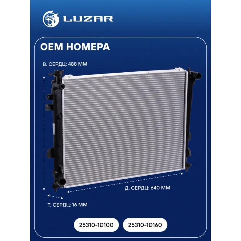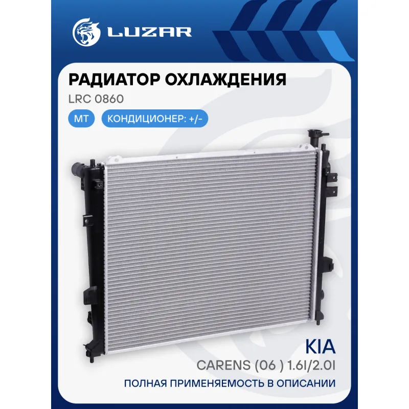 Радиатор охлаждения для автомобилей Carens (06-) 1.6i/2.0i MT Характеристики: Артикул: LRc 0860 OEM номера: 25310-1D100, 25310-1D160 Трансмиссия: MT Кондиционер: +/- Длина сердцевины, мм: 640 Высота сердцевины, мм: 488 Толщина сердцевины, мм: 16 Сопутствующий товар: Радиаторы кондиционера (конденсеры): LRAC 0860 Подходит для авто: Kia Carens II (06-) Для проверки применяемости отправьте VIN автомобиля через вкладку "Есть вопросы о товаре?" Комплектация: Радиатор охлаждения Паспорт изделия Гарантия: от 1 года.