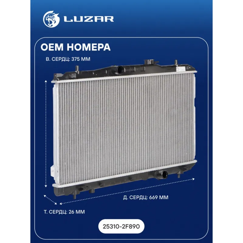 Радиатор охлаждения для автомобилей Cerato (04-) 1.6i/2.0i MT (рестайлинг 06-) (тип Dowoon) Характеристики: Артикул: LRc 0813 OEM номера: 25310-2F890 Трансмиссия: MT Кондиционер: +/- Длина сердцевины, мм: 669 Высота сердцевины, мм: 375 Толщина сердцевины, мм: 26 Тип сердцевины: паяная Материал сердцевины: алюминий Материал бачков: пластик Примечание: для рейсталинговых авто с 2006 г. Подходит для авто: Kia Cerato I (04-) Для проверки применяемости отправьте VIN автомобиля через вкладку "Есть вопросы о товаре?" Комплектация: Радиатор охлаждения Паспорт изделия Гарантия: от 1 года.