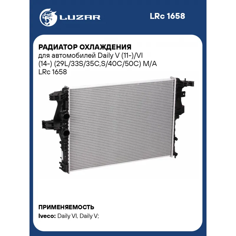 Радиатор охлаждения для автомобилей Daily V (11-)/VI (14-) (29L/33S/35C,S/40C/50C) M/A Характеристики: Артикул: LRc 1658 OEM номера: 5801264635 Трансмиссия: MT Кондиционер: +/- Длина сердцевины, мм: 640 Высота сердцевины, мм: 442 Толщина сердцевины, мм: 32 Сопутствующий товар: Радиаторы кондиционера (конденсеры): LRAC 1658 Подходит для авто: Iveco Daily VI (14-), Daily V (11-) Для проверки применяемости отправьте VIN автомобиля через вкладку "Есть вопросы о товаре?" Комплектация: Радиатор охлаждения Паспорт изделия Гарантия: от 1 года.