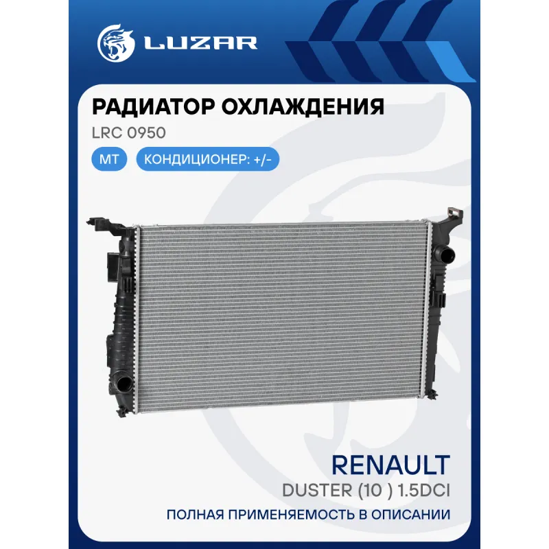 Радиатор охлаждения для автомобилей Duster (10-) 1.5dCi Характеристики: Артикул: LRc 0950 OEM номера: 8200880550 Трансмиссия: MT Кондиционер: +/- Длина сердцевины, мм: 628 Высота сердцевины, мм: 368 Толщина сердцевины, мм: 26 Сопутствующий товар: Радиаторы кондиционера (конденсеры): LRAC 0950 Подходит для авто: Renault Duster (10-) Для проверки применяемости отправьте VIN автомобиля через вкладку "Есть вопросы о товаре?" Комплектация: Радиатор охлаждения Паспорт изделия Гарантия: от 1 года.