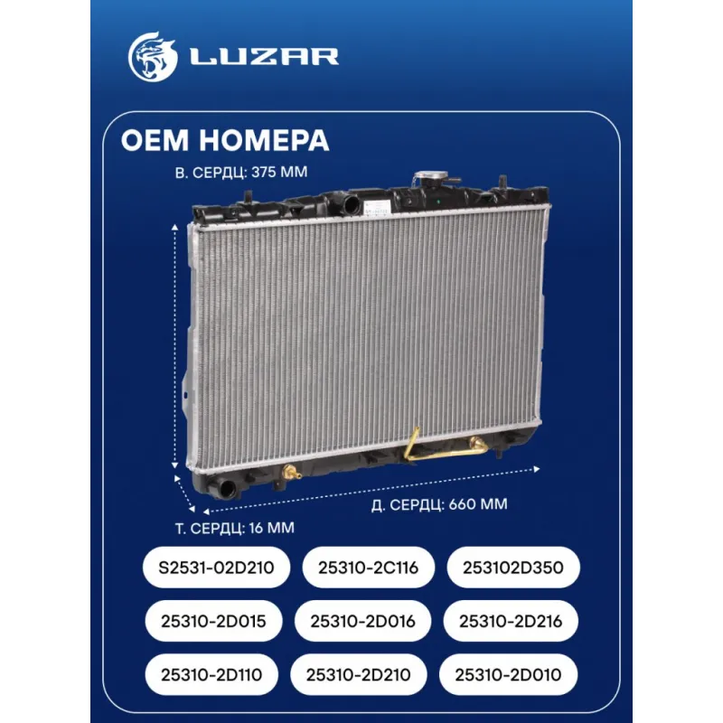 Радиатор охлаждения для автомобилей Elantra (00-) AT Характеристики: Артикул: LRc HUEl00210 OEM номера: 25310-2D110, 25310-2D210, 25310-2D010, 25310-2D015, 25310-2D016, 25310-2D216, S2531-02D210, 25310-2c116, 253102D350 Трансмиссия: AT Кондиционер: +/- Длина сердцевины, мм: 660 Высота сердцевины, мм: 375 Толщина сердцевины, мм: 16 Сопутствующий товар: Электровентиляторы охлаждения: LFK 0803 Сопутствующий товар: Электровентиляторы кондиционера: LFAC 0803 Сопутствующий товар: Радиаторы кондиционера (конденсеры): LRAC 08D2 Сопутствующий товар: Крышки (пробки) радиатора: LL 1905 Подходит для авто: Hyundai Avante XD (00-), Elantra III (00-) Для проверки применяемости отправьте VIN автомобиля через вкладку "Есть вопросы о товаре?" Комплектация: Радиатор охлаждения Паспорт изделия Гарантия: от 1 года.