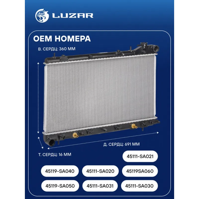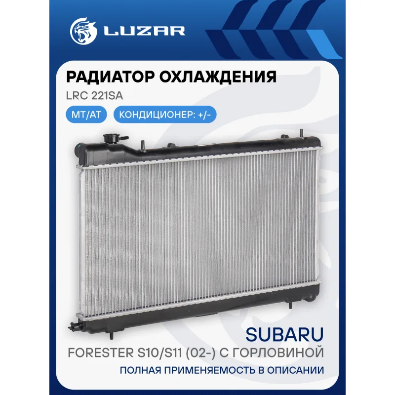 Радиатор охлаждения для автомобилей Forester S10/S11 (02-) с горловиной Характеристики: Артикул: LRc 221SA OEM номера: 45119-SA050, 45111-SA031, 45111-SA030, 45119-SA040, 45111-SA020, 45119SA060, 45111-SA021 Трансмиссия: MT/AT Кондиционер: +/- Длина сердцевины, мм: 691 Высота сердцевины, мм: 360 Толщина сердцевины, мм: 16 Сопутствующий товар: Крышки (пробки) радиатора: LL 1905 Подходит для авто: Subaru Forester SG (02-) Для проверки применяемости отправьте VIN автомобиля через вкладку "Есть вопросы о товаре?" Комплектация: Радиатор охлаждения Паспорт изделия Гарантия: от 1 года.