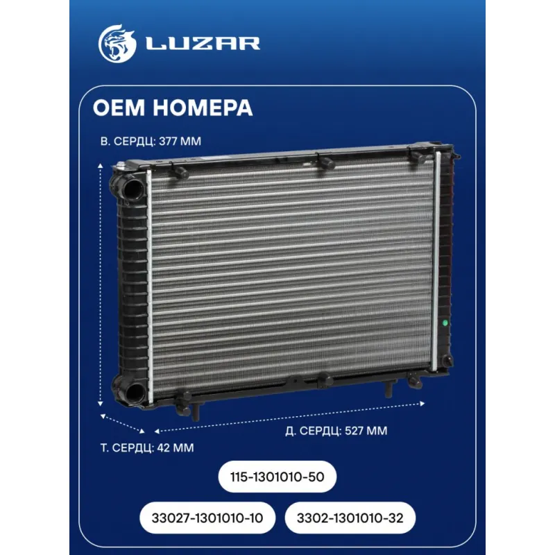 Радиатор охлаждения для автомобилей ГАЗ 3302 ГАЗель-Бизнес (сборный, 3-х ряд.) Характеристики: Артикул: LRc 0327 OEM номера: 33027-1301010-10, 3302-1301010-32, 115-1301010-50 Трансмиссия: MT Кондиционер: +/- Длина сердцевины, мм: 527 Высота сердцевины, мм: 377 Толщина сердцевины, мм: 42 Тип сердцевины: сборная, 3-х рядная Материал сердцевины: алюминий Материал бачков: пластик Сопутствующий товар: Патрубки охлаждения (комплект): LPK 0306, LPK 0306s, LPK 03027, LPK 03029 Аналог: LRc 03027b (паяная сердцевина), LRc 0303 (с увелич. толщиной сердцевины, повыш. теплоотдача) Подходит для авто: ГАЗ 3302, 2217, 2752, 2705, 3221, 33027, Gazelle-Business, Gazelle-Business, 33025, Gazelle Для проверки применяемости отправьте VIN автомобиля через вкладку "Есть вопросы о товаре?" Комплектация: Радиатор охлаждения Паспорт изделия Гарантия: от 1 года.