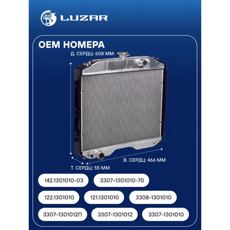 Радиатор охлаждения для автомобилей ГАЗ 3307/3308 с двигателем ЗМЗ-511, ЗМЗ-513, ММЗ Д245.7 Характеристики: Артикул: LRc 0337b OEM номера: 3307-1301012П, 3307-1301012, 3307-1301010, 122.1301010, 121.1301010, 3307-1301010-70, 142.1301010-03, 3308-1301010, 121.1301010-10 Сопутствующий товар: Патрубки охлаждения (комплект): LPK 0337s Трансмиссия: MT Кондиционер: - Длина сердцевины, мм: 608 Высота сердцевины, мм: 466 Толщина сердцевины, мм: 55 Тип сердцевины: паяная Материал сердцевины: алюминий Материал бачков: алюминий Подходит для авто: ГАЗ 3307, 3309, 3309, 3308 Для проверки применяемости отправьте VIN автомобиля через вкладку "Есть вопросы о товаре?" Комплектация: Радиатор охлаждения Паспорт изделия Гарантия: от 1 года.
