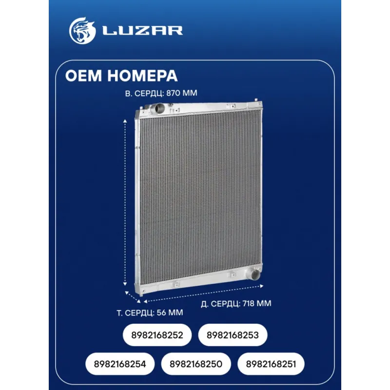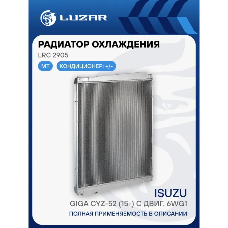 Радиатор охлаждения для автомобилей Isuzu Giga CYZ-52 (15-) с двиг. 6WG1 Характеристики: Артикул: LRc 2905 OEM номера: 8982168254, 8982168250, 8982168251, 8982168252, 8982168253 Трансмиссия: MT Кондиционер: +/- Длина сердцевины, мм: 718 Высота сердцевины, мм: 870 Толщина сердцевины, мм: 56 Тип сердцевины: паяная, 2-х рядная Материал сердцевины: алюминий Материал бачков: алюминий Тип конструкции: без металлической рамки Подходит для авто: ISUZU Giga CYZ-52 (15-) Для проверки применяемости отправьте VIN автомобиля через вкладку "Есть вопросы о товаре?" Комплектация: Радиатор охлаждения - 1 шт Паспорт изделия - 1 шт Гарантия: от 1 года.