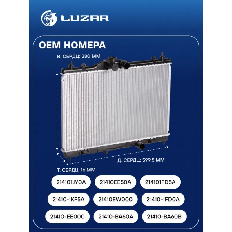 Радиатор охлаждения для автомобилей Juke (10-) 1.6i Характеристики: Артикул: LRc 141EE OEM номера: 21410-EE000, 21410-BA60A, 21410-BA60B, 21410-1KF5A, 21410EW000, 21410-1FD0A, 214101JY0A, 21410EE50A, 214101FD5A Трансмиссия: MT/AT Кондиционер: +/- Длина сердцевины, мм: 599.5 Высота сердцевины, мм: 380 Толщина сердцевины, мм: 16 Сопутствующий товар: Радиаторы кондиционера (конденсеры): LRAC 14AX Подходит для авто: Nissan Juke (10-), Tiida (04-) Для проверки применяемости отправьте VIN автомобиля через вкладку "Есть вопросы о товаре?" Комплектация: Радиатор охлаждения Гарантийный талон Гарантия: от 1 года.