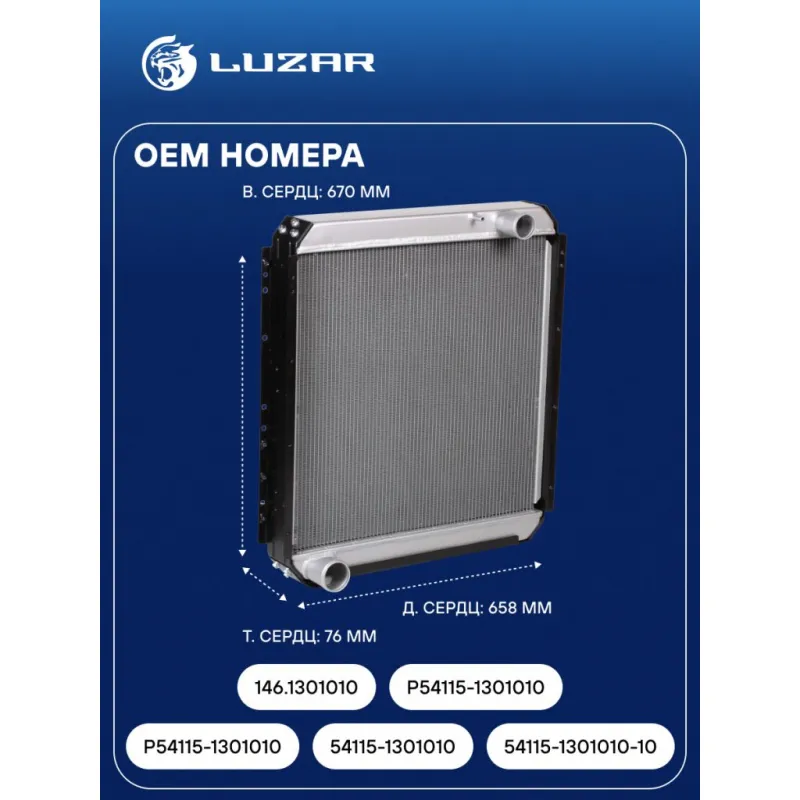 Радиатор охлаждения для автомобилей КАМАЗ 54115 (Heavy Duty) (повышенная теплоотдача, сердцевина 76мм) Характеристики: Артикул: LRc 07150 OEM номера: Р54115-1301010, 54115-1301010, 54115-1301010-10, 146.1301010, P54115-1301010, 45104130101001 Сопутствующий товар:: LRc 0715b Трансмиссия: MT Кондиционер: - Длина сердцевины, мм: 658 Высота сердцевины, мм: 670 Толщина сердцевины, мм: 76 Тип сердцевины: паяная, 3-х рядная Материал сердцевины: алюминий Материал бачков: алюминий Сопутствующий товар: Патрубки охлаждения (комплект): LPK 0723, LPK 0709s Примечание: Аналог изделия LRc 0715b, но с увеличенной толщиной сердцевины 76мм, имеет повышенную теплоотдачу Подходит для авто: КамаАЗ 65115, 54115, 43118, 43114 Для проверки применяемости отправьте VIN автомобиля через вкладку "Есть вопросы о товаре?" Комплектация: Радиатор охлаждения Паспорт изделия Гарантия: от 1 года.