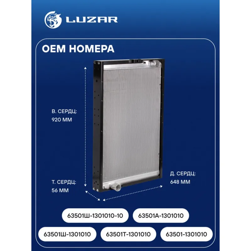 Радиатор охлаждения для автомобилей КАМАЗ 6350 Характеристики: Артикул: LRc 07350 OEM номера: 63501Ш-1301010 , 63501Т-1301010, 63501-1301010 , 63501Ш-1301010-10, 63501А-1301010 Трансмиссия: MT Кондиционер: - Длина сердцевины, мм: 648 Высота сердцевины, мм: 920 Толщина сердцевины, мм: 56 Подходит для авто: КамаАЗ 6350 Для пр... Читать полностью →