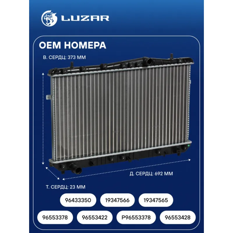 Радиатор охлаждения для автомобилей Lacetti (04-) 1.4i/1.6i/1.8i MT (сборный) Характеристики: Артикул: LRc CHLt04178 OEM номера: 96553378, 96553422, P96553378, 96553428, 96433350, 19347566 , 19347565 Трансмиссия: MT Кондиционер: +/- Длина сердцевины, мм: 692 Высота сердцевины, мм: 373 Толщина сердцевины, мм: 23 Тип сердцевины: сборная Материал сердцевины: алюминий Материал бачков: пластик Сопутствующий товар: Электровентиляторы охлаждения: LFc 0564 Сопутствующий товар: Электровентиляторы кондиционера: LFAC 0541 Сопутствующий товар: Радиаторы кондиционера (конденсеры): LRAC 0578 Сопутствующий товар: Крышки (пробки) расширительного бачка: LL 0563 Сопутствующий товар: Патрубки охлаждения (комплект): LPK 0561; LPK 05610, LPK 0552 Сопутствующий товар: Бачки расширительные: LET 0572 Аналог: LRc 0505 (паяная сердцевина) Подходит для авто: Daewoo Nubira III (03-), Gentra (13-) Chevrolet Lacetti (02-) Для проверки применяемости отправьте VIN автомобиля через вкладку "Есть вопросы о товаре?" Комплектация: Радиатор охлаждения Папорт изделия Гарантия: от 1 года.