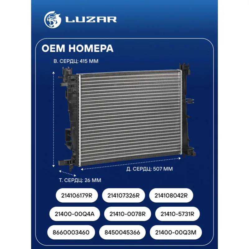 Радиатор охлаждения для автомобилей Лада Vesta (15-)/Logan II (12-)/Kaptur (16-)/Duster (21-) A/C+(сборный) Характеристики: Артикул: LRc 0978 OEM номера: 8660003460, 8450045366, 21400-00Q3M, 21400-00Q4A, 21410-0078R, 21410-5731R, 214106179R, 214107326R, 214108042R Трансмиссия: MT/AT Кондиционер: +/- Длина сердцевины, мм: 507 Высота сердцевины, мм: 415 Толщина сердцевины, мм: 26 Тип сердцевины: сборная Материал сердцевины: алюминий Материал бачков: пластик Сопутствующий товар: Электровентиляторы охлаждения: LFK 0978; LFK 0979 Сопутствующий товар: Радиаторы кондиционера (конденсеры): LRAC 0978 Сопутствующий товар: Патрубки охлаждения (комплект): LPK 0117, LPK 01172, LPK 0180 Сопутствующий товар: Блоки охлаждения (радиатор + конденсор + вентилятор): LRK 0978 Аналог: LRc 0901 (паяная сердцевина) Подходит для авто: Renault Kaptur (16-), Arkana (19-), Duster II (21-), Logan II (12-), Sandero II (14-) ВАЗ Vesta NG (23-), Largus FL (21-), Vesta (15-), Vesta (15-), X-Ray (15-), Vesta NG (23-) Nissan Terrano (14-) Для проверки применяемости отправьте VIN автомобиля через вкладку "Есть вопросы о товаре?" Комплектация: Радиатор охлаждения Паспорт изделия Гарантия: от 1 года.