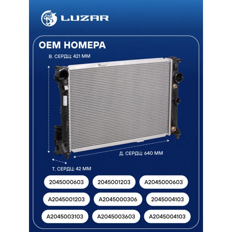 Радиатор охлаждения для автомобилей Mercedes C (W204) (07-)/E (W212) (09-) Характеристики: Артикул: LRc 15113 OEM номера: A2045003103, A2045003603, A2045004103, A2045001203, A2045000306, 2045004103, 2045000603, 2045001203, A2045000603, 2045003103, 2045003603, 2045000306 Материал сердцевины: алюминий Материал бачков: пластик Тип сердцевины: паяная Трансмиссия: AT Кондиционер: +/- Длина сердцевины, мм: 640 Высота сердцевины, мм: 421 Толщина сердцевины, мм: 42 Сопутствующий товар: Электровентиляторы охлаждения: LFK 1550 Сопутствующий товар: Радиаторы кондиционера (конденсеры): LRAC 1512 Подходит для авто: Mercedes-Benz C-Class W204 (07-), E-Class W212 (09-), GLK X204 (08-) Для проверки применяемости отправьте VIN автомобиля через вкладку "Есть вопросы о товаре?" Комплектация: Радиатор охлаждения Паспорт изделия Гарантия: от 1 года.
