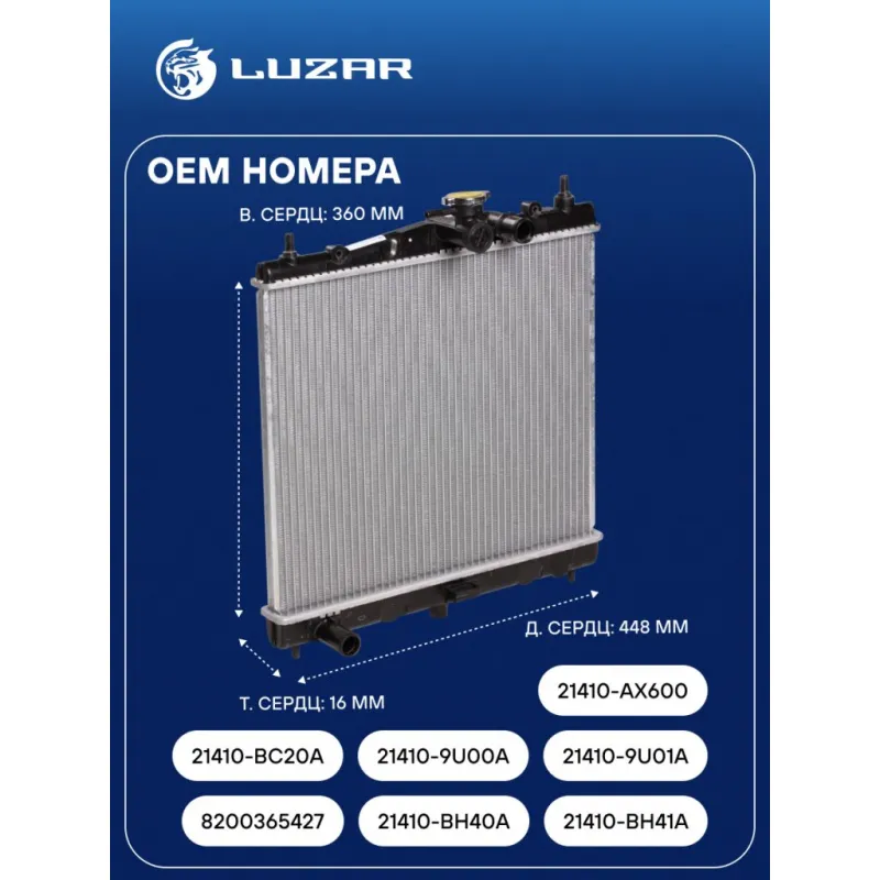 Радиатор охлаждения для автомобилей Note (06-)/Micra (02-) MT Характеристики: Артикул: LRc 14AX OEM номера: 8200365427, 21410-BH40A, 21410-BH41A, 21410-BC20A, 21410-9U00A, 21410-9U01A, 21410-AX600 Трансмиссия: MT Кондиционер: +/- Длина сердцевины, мм: 448 Высота сердцевины, мм: 360 Толщина сердцевины, мм: 16 Сопутствующий товар: Электровентиляторы охлаждения: LFK 1411 Сопутствующий товар: Радиаторы кондиционера (конденсеры): LRAC 14AX Сопутствующий товар: Крышки (пробки) радиатора: LL 0809 Сопутствующий товар: Крышки (пробки) расширительного бачка: LL 0998 Подходит для авто: Renault Modus (02-), Clio III (05-) Nissan Note (06-), Micra K12 (02-) Для проверки применяемости отправьте VIN автомобиля через вкладку "Есть вопросы о товаре?" Комплектация: Радиатор охлаждения Паспорт изделия Гарантия: от 1 года.