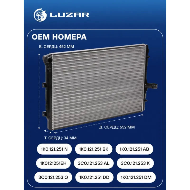 Радиатор охлаждения для автомобилей Octavia A5 (04-)/VW Golf V (03-)/Passat (05-) 1.6D/2.0D/2.0T Характеристики: Артикул: LRc 1803 OEM номера: 1K0.121.251 N, 1K0.121.251 BK, 1K0.121.251 AB, 1K0121251EH, 3C0.121.253 AL, 3C0.121.253 K, 3C0.121.253 Q, 1K0.121.251 DD, 1K0.121.251 DM, 3C0121253AR Сопутствующий товар: Элементы для уплотнения соединений: LGS 0032 Трансмиссия: MT/AT Кондиционер: +/- Длина сердцевины, мм: 652 Высота сердцевины, мм: 452 Толщина сердцевины, мм: 34 Тип сердцевины: сборная Материал сердцевины: алюминий Материал бачков: пластик Сопутствующий товар: Электровентиляторы охлаждения: LFc 1803; LFc 18K2; LFK 18K2 Сопутствующий товар: Электровентиляторы кондиционера: LFAC 18K0 Сопутствующий товар: Радиаторы кондиционера (конденсеры): LRAC 1811; LRAC 1811J; LRAC 181C; LRAC 181D; LRAC 18L3 Сопутствующий товар: Крышки (пробки) расширительного бачка: LL 1835 Подходит для авто: Audi A3 (03-), TT (06-), A3 (03-) Skoda Octavia A5 (04-), Superb II (08-), Yeti (09-), Octavia A5 (04-) Volkswagen Passat CC (08-), Touran (03-), Scirocco (08-), Passat B6 (05-), Caddy (04-) Seat Altea (04-), Leon (05-) Для проверки применяемости отправьте VIN автомобиля через вкладку "Есть вопросы о товаре?" Комплектация: Радиатор охлаждения Паспорт изделия Гарантия: от 1 года.