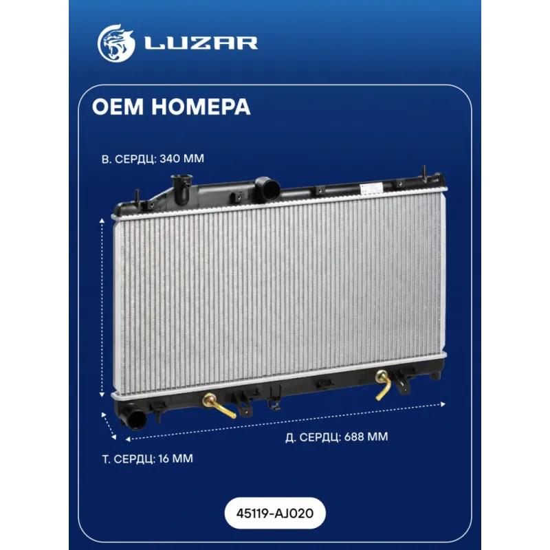 Радиатор охлаждения для автомобилей Outback (09-)/Legacy (09-) 2.0i/2.5i AT Характеристики: Артикул: LRc 22113 OEM номера: 45119-AJ020 Трансмиссия: AT Кондиционер: +/- Длина сердцевины, мм: 688 Высота сердцевины, мм: 340 Толщина сердцевины, мм: 16 Сопутствующий товар: Электровентиляторы охлаждения: LFK 2212 Сопутствующий товар: Крышки (пробки) радиатора: LL 1905 Подходит для авто: Subaru Outback B13 (03-), Legacy B14 (09-) Для проверки применяемости отправьте VIN автомобиля через вкладку "Есть вопросы о товаре?" Комплектация: Радиатор охлаждения Паспорт изделия Гарантия: от 1 года.