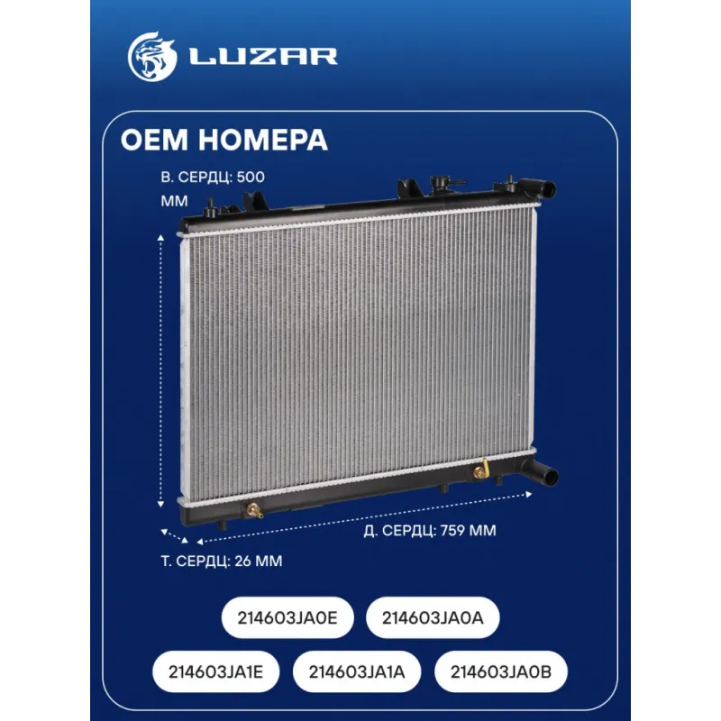 Радиатор охлаждения для автомобилей Pathfinder (12-)/Infiniti QX60 (13-) Характеристики: Артикул: LRc 1411 OEM номера: 214603JA1E, 214603JA1A, 214603JA0B, 214603JA0E, 214603JA0A Трансмиссия: MT/AT Кондиционер: +/- Длина сердцевины, мм: 759 Высота сердцевины, мм: 500 Толщина сердцевины, мм: 26 Тип сердцевины: паяная Сопутствующий товар: Радиаторы кондиционера (конденсеры): LRAC 1460 Подходит для авто: Nissan Pathfinder R52 (12-) Infiniti QX60 (13-) Для проверки применяемости отправьте VIN автомобиля через вкладку "Есть вопросы о товаре?" Комплектация: Радиатор охлаждения Паспорт изделия Гарантия: от 1 года.