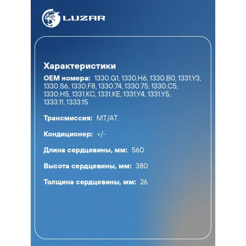 Радиатор охлаждения для автомобилей Peugeot 206 (98-) M/A Характеристики: Артикул: LRc 20G1 OEM номера: 1330.G1, 1330.H6, 1330.B0, 1331.Y3, 1330.S6, 1330.F8, 1330.74, 1330.75, 1330.C5, 1330.H5, 1331.KC, 1331.KE, 1331.Y4, 1331.Y5, 1333.11, 1333.15, 1333.27, 9647421380, 1330.38, 1330.40, 1330.53, 1330.65, 1330.69, 1330.82, 1330.83, 1330.84, 1330.A1, 1330.B1, 1330.B5, 1330.E8, 1330.G0, 1330.G3, 1330.G5, 1330.H3, 1330.H4, 1330.N5, 1330.N7, 1330.V5, 1333.18, 1333.25, 1333A6, 1330J3, 1330Y3, 133328, 1130.J3, 1330.YE, 9674089580, 1330X7, 1333A5, 1330.C4, 1610008180, 1331.LS, 1331.KF, 9632198080, 9637040680, 1610008280, 133351, 1330C6, 1330Y2, 1331TN, 1331X6, 1333S1, E101J03, 1330N1, 133373, 133314 Трансмиссия: MT/AT Кондиционер: +/- Длина сердцевины, мм: 560 Высота сердцевины, мм: 380 Толщина сердцевины, мм: 26 Сопутствующий товар: Электровентиляторы охлаждения: LFc 20206; LFK 20206; LFK 20207 Подходит для авто: Peugeot 206 (00-) Для проверки применяемости отправьте VIN автомобиля через вкладку "Есть вопросы о товаре?" Комплектация: Радиатор охлаждения Паспорт изделия Гарантия: от 1 года.