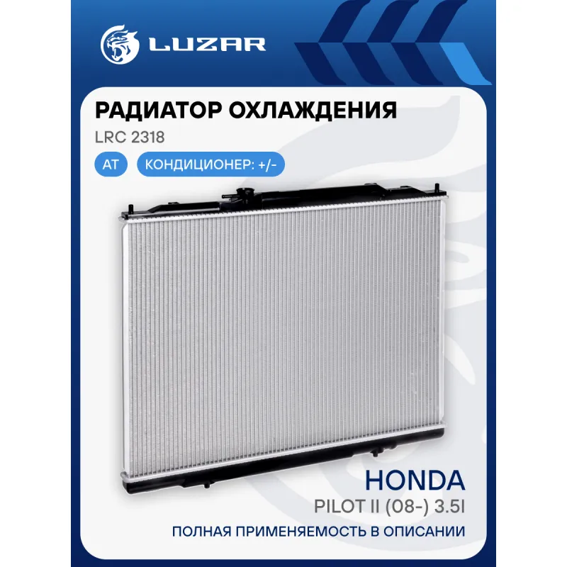 Радиатор охлаждения для автомобилей Pilot II (08-) 3.5i AT Характеристики: Артикул: LRc 2318 OEM номера: 19010RN0A51, 19010RN0A52, 19010RN0R01, 19010RN0R02 Трансмиссия: AT Кондиционер: +/- Длина сердцевины, мм: 768 Высота сердцевины, мм: 550 Толщина сердцевины, мм: 26 Сопутствующий товар: Радиаторы кондиционера (конденсеры): LRAC 2318 Сопутствующий товар: Крышки (пробки) радиатора: LL 1902 Подходит для авто: Honda Pilot (08-) Для проверки применяемости отправьте VIN автомобиля через вкладку "Есть вопросы о товаре?" Комплектация: Радиатор охлаждения Паспорт изделия Гарантия: от 1 года.