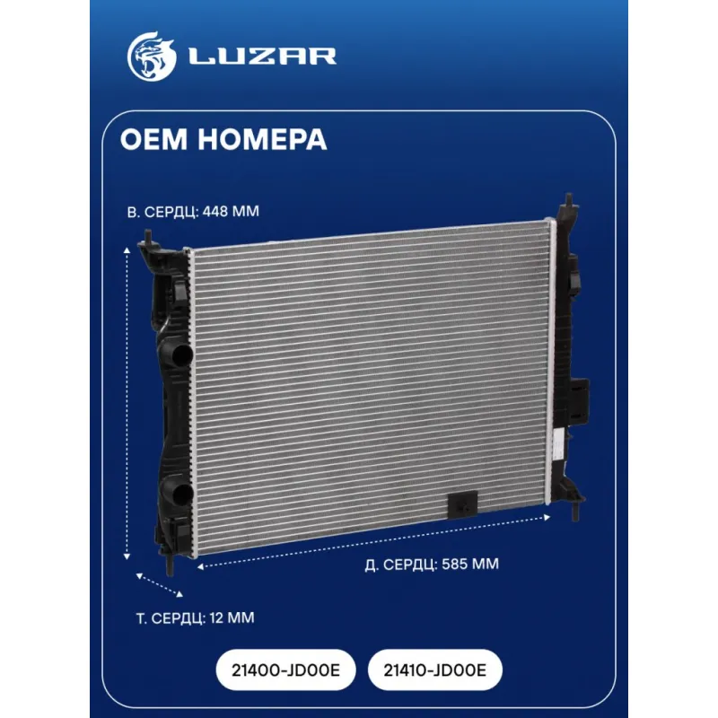 Радиатор охлаждения для автомобилей Qashqai (06-) 1.6i MT (с пароотвод. штуцером) Характеристики: Артикул: LRc 1401 OEM номера: 21400-JD00E, 21410-JD00E Сопутствующий товар: Патрубки охлаждения (комплект): LPK 14J01, LPK 14J02, LPK 14J03 Трансмиссия: MT/AT Кондиционер: +/- Длина сердцевины, мм: 585 Высота сердцевины, мм: 448 Толщина сердцевины, мм: 12 Сопутствующий товар: Электровентиляторы охлаждения: LFK 14JD Сопутствующий товар: Радиаторы кондиционера (конденсеры): LRAC 1420 Сопутствующий товар: Крышки (пробки) расширительного бачка: LL 0998 Подходит для авто: Nissan Qashqai J10 (06-) Для проверки применяемости отправьте VIN автомобиля через вкладку "Есть вопросы о товаре?" Комплектация: Паспорт изделия Радиатор охлаждения Гарантия: от 1 года.