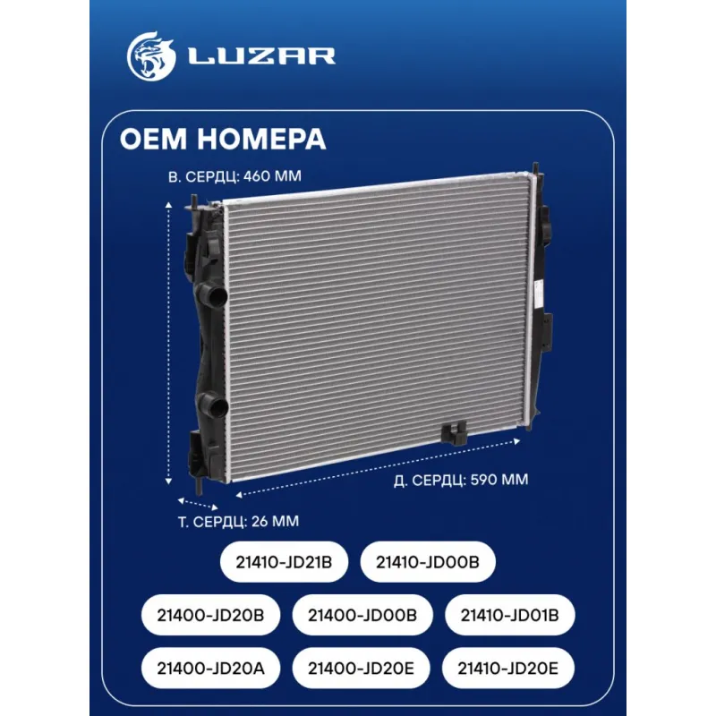 Радиатор охлаждения для автомобилей Qashqai (06-) 2.0i CVT Характеристики: Артикул: LRc 141JA OEM номера: 21400-JD20A, 21400-JD20E, 21410-JD20E, 21400-JD20B, 21400-JD00B, 21410-JD01B, 21410-JD21B, 21410-JD00B Сопутствующий товар: Патрубки охлаждения (комплект): LPK 141JA1,LPK 141JA2, LPK 141JA3 Трансмиссия: MT/AT Кондиционер: +/- Длина сердцевины, мм: 590 Высота сердцевины, мм: 460 Толщина сердцевины, мм: 26 Сопутствующий товар: Электровентиляторы охлаждения: LFK 14JD Сопутствующий товар: Радиаторы кондиционера (конденсеры): LRAC 1420 Сопутствующий товар: Крышки (пробки) расширительного бачка: LL 0998 Подходит для авто: Nissan Qashqai J10 (06-) Для проверки применяемости отправьте VIN автомобиля через вкладку "Есть вопросы о товаре?" Комплектация: Радиатор охлаждения Паспорт изделия Гарантия: от 1 года.
