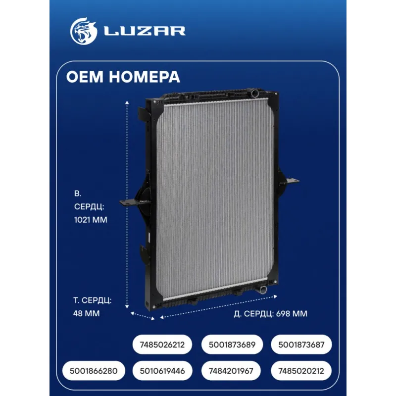 Радиатор охлаждения для автомобилей Renault Trucks Magnum (04-) (с рамкой) Характеристики: Артикул: LRc 0934 OEM номера: 5001866280, 5010619446, 7484201967, 7485020212, 5001873687, 5001873689, 7485026212 Трансмиссия: MT Кондиционер: +/- Длина сердцевины, мм: 698 Высота сердцевины, мм: 1021 Толщина сердцевины, мм: 48 Тип сердцевины: паяная Материал бачков: пластик Сопутствующий товар: Радиаторы кондиционера (конденсеры): LRAC 0925 Тип конструкции: с металлической рамкой Подходит для авто: RENAULT TRUCKS Magnum (04-) Для проверки применяемости отправьте VIN автомобиля через вкладку "Есть вопросы о товаре?" Комплектация: Радиатор охлаждения Паспорт изделия Гарантия: от 1 года.