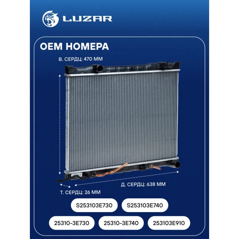 Радиатор охлаждения для автомобилей Sorento (06-) 2.5Tci AT Характеристики: Артикул: LRc 081E3 OEM номера: 25310-3E730, 25310-3E740, 253103E910, S253103E730, S253103E740 Трансмиссия: AT Кондиционер: +/- Длина сердцевины, мм: 638 Высота сердцевины, мм: 470 Толщина сердцевины, мм: 26 Сопутствующий товар: Радиаторы кондиционера (конденсеры): LRAC 08E1; LRAC 08E3 Сопутствующий товар: Крышки (пробки) радиатора: LL 1905 Подходит для авто: Kia Sorento (06-) Для проверки применяемости отправьте VIN автомобиля через вкладку "Есть вопросы о товаре?" Комплектация: Радиатор охлаждения Паспорт изделия Гарантия: от 1 года.