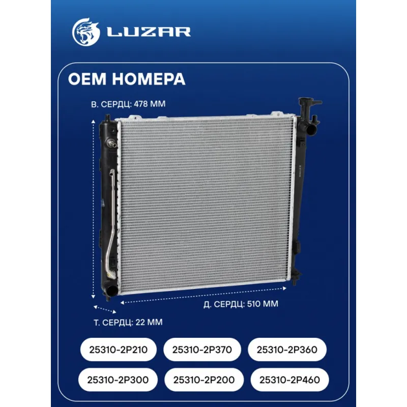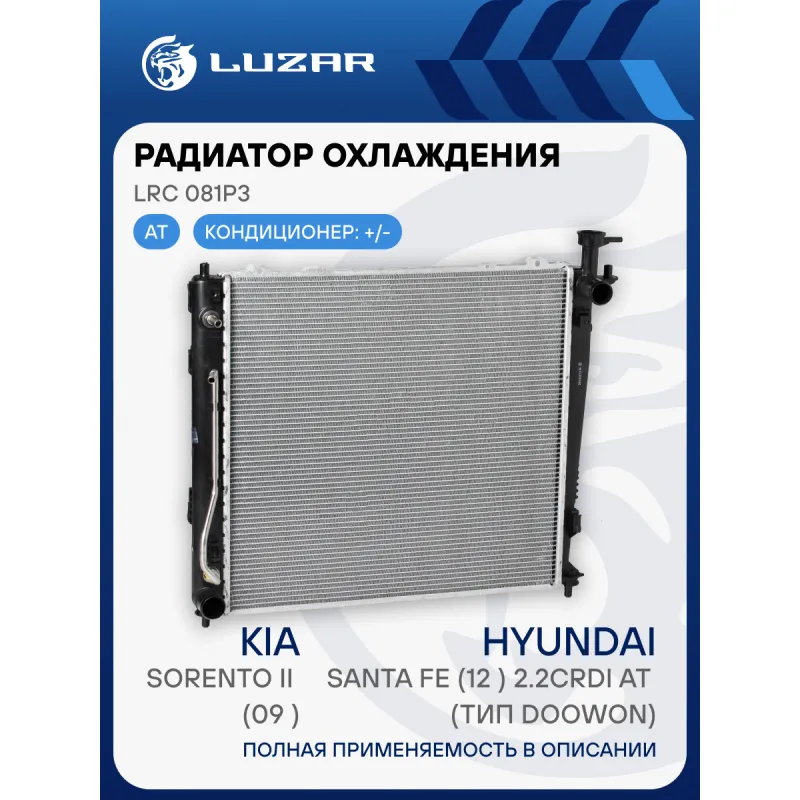 Радиатор охлаждения для автомобилей Sorento II (09-)/Santa Fe (12-) 2.2CRDi AT (тип Doowon) Характеристики: Артикул: LRc 081P3 OEM номера: 25310-2P300, 25310-2P200, 25310-2P460, 25310-2P210, 25310-2P370, 25310-2P360 Сопутствующий товар: Патрубки охлаждения (комплект): LPK 081231, LPK 081232 Трансмиссия: AT Кондиционер: +/- Длина сердцевины, мм: 510 Высота сердцевины, мм: 478 Толщина сердцевины, мм: 22 Сопутствующий товар: Радиаторы кондиционера (конденсеры): LRAC 0823 Подходит для авто: Kia Sorento II (09-) Hyundai Santa Fe III (12-) Для проверки применяемости отправьте VIN автомобиля через вкладку "Есть вопросы о товаре?" Комплектация: Радиатор охлаждения Паспорт изделия Гарантия: от 1 года.