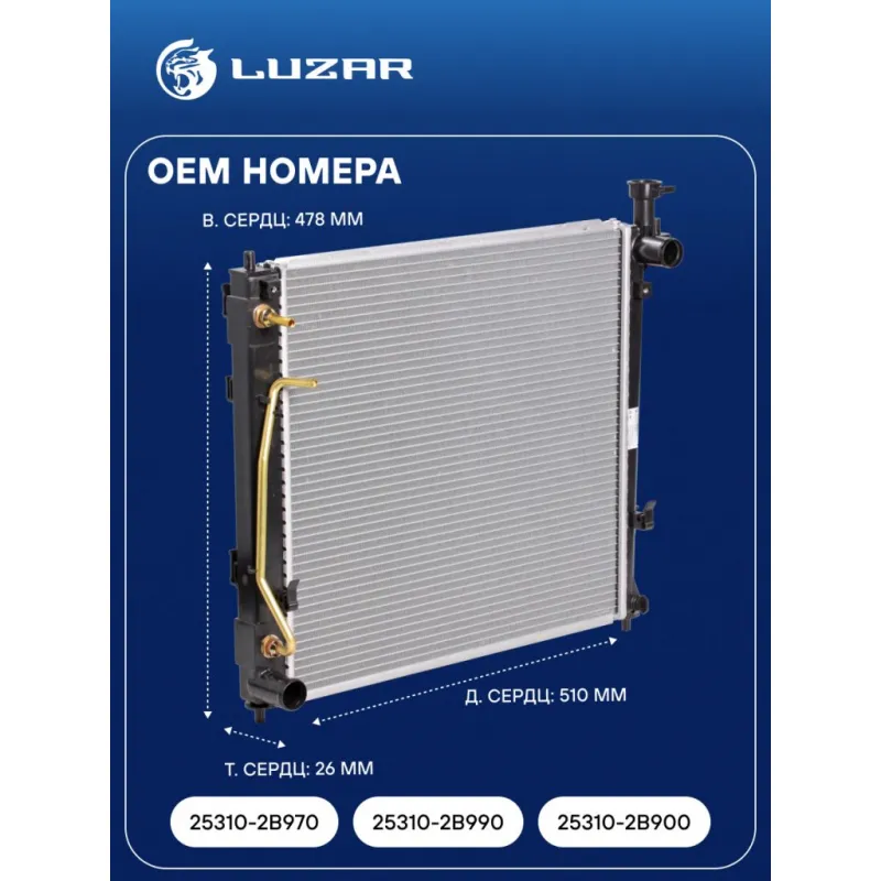 Радиатор охлаждения для автомобилей Sorento II (09-)/Santa Fe (12-) 2.2CRDi AT (тип Halla) Характеристики: Артикул: LRc 08123 OEM номера: 25310-2B970, 25310-2B990, 25310-2B900, 25310-B8160 Сопутствующий товар: Патрубки охлаждения (комплект): LPK 081231, LPK 081232 Трансмиссия: AT Кондиционер: +/- Длина сердцевины, мм: 510 Высота сердцевины, мм: 478 Толщина сердцевины, мм: 26 Сопутствующий товар: Электровентиляторы охлаждения: LFK 0802; LFK 0822 Сопутствующий товар: Радиаторы кондиционера (конденсеры): LRAC 0821; LRAC 0823; LRAC 0863 Подходит для авто: Hyundai Santa Fe II (06-), Santa Fe III (12-) Kia Sorento II (09-) Для проверки применяемости отправьте VIN автомобиля через вкладку "Есть вопросы о товаре?" Комплектация: Радиатор охлаждения Паспорт изделия Гарантия: от 1 года.
