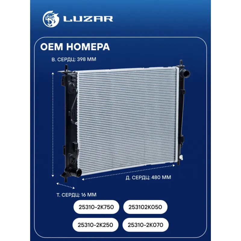 Радиатор охлаждения для автомобилей Soul (08-) D AT Характеристики: Артикул: LRc 081K2 OEM номера: 25310-2K250, 25310-2K070, 25310-2K750, 253102K050, 25310-2K520 Трансмиссия: AT Кондиционер: +/- Длина сердцевины, мм: 480 Высота сердцевины, мм: 398 Толщина сердцевины, мм: 16 Сопутствующий товар: Радиаторы кондиционера (конденсеры): LRAC 08K2 Подходит для авто: Kia Soul I (08-) Для проверки применяемости отправьте VIN автомобиля через вкладку "Есть вопросы о товаре?" Комплектация: Радиатор охлаждения Паспорт изделия Гарантия: от 1 года.