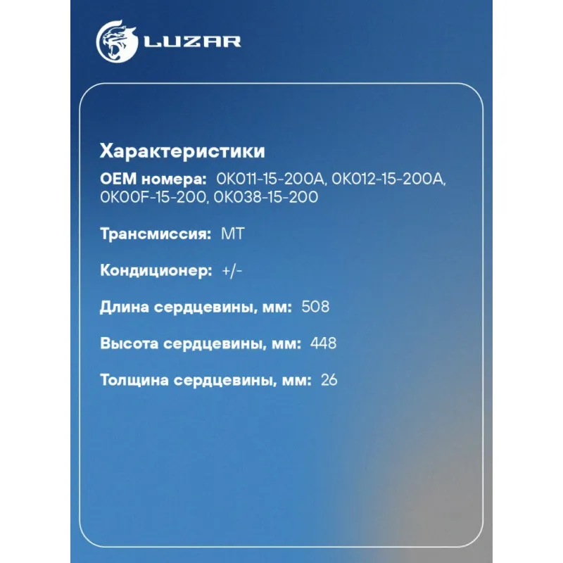 Радиатор охлаждения для автомобилей Sportage I (99-) MT Характеристики: Артикул: LRc 0812 OEM номера: 0K011-15-200A, 0K012-15-200A, 0K00F-15-200, 0K038-15-200 Трансмиссия: MT Кондиционер: +/- Длина сердцевины, мм: 508 Высота сердцевины, мм: 448 Толщина сердцевины, мм: 26 Сопутствующий товар: Крышки (пробки) радиатора: LL 0809 Подходит для авто: Kia Sportage I (93-) Для проверки применяемости отправьте VIN автомобиля через вкладку "Есть вопросы о товаре?" Комплектация: Радиатор охлаждения Паспорт изделия Гарантия: от 1 года.