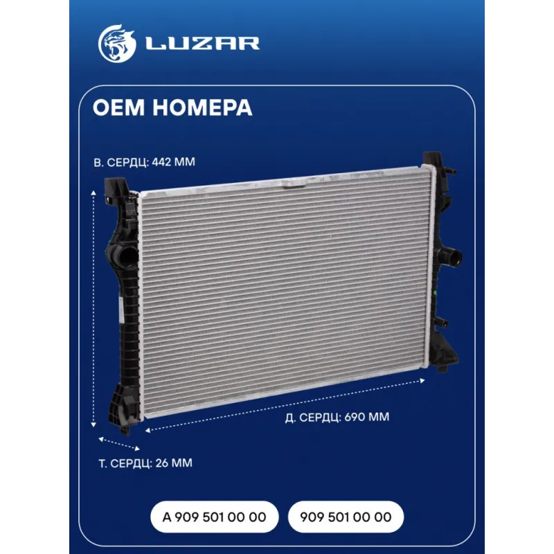 Радиатор охлаждения для автомобилей Mercedes-Benz Sprinter Classic (909) (13-) Характеристики: Артикул: LRc 1509 OEM номера: A 909 501 00 00, 909 501 00 00 Трансмиссия: MT Кондиционер: +/- Длина сердцевины, мм: 690 Высота сердцевины, мм: 442 Толщина сердцевины, мм: 26 Сопутствующий товар: Радиаторы кондиционера (конденсеры): LRAC 1509 Подходит для авто: Mercedes-Benz Sprinter Classic (13-) Для проверки применяемости отправьте VIN автомобиля через вкладку "Есть вопросы о товаре?" Комплектация: Радиатор охлаждения Паспорт изделия Гарантия: от 1 года.
