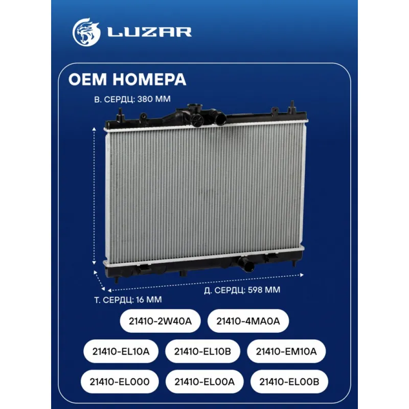 Радиатор охлаждения для автомобилей Tiida (04-) MT Характеристики: Артикул: LRc 14EL OEM номера: 21410-EL000, 21410-EL00A, 21410-EL00B, 21410-EL10A, 21410-EL10B, 21410-EM10A, 21410-2W40A, 21410-4MA0A Трансмиссия: MT/AT Кондиционер: +/- Длина сердцевины, мм: 598 Высота сердцевины, мм: 380 Толщина сердцевины, мм: 16 Подходит для авто: Nissan Tiida (15-), Sentra (14-), Tiida (04-) Для проверки применяемости отправьте VIN автомобиля через вкладку "Есть вопросы о товаре?" Комплектация: Радиатор охлаждения Паспорт изделия Гарантия: от 1 года.