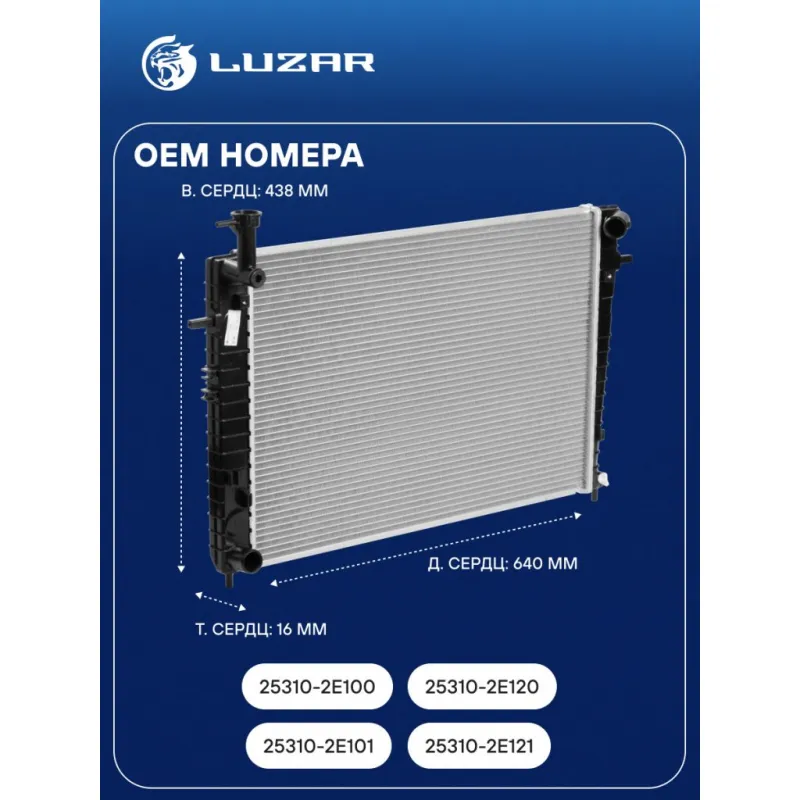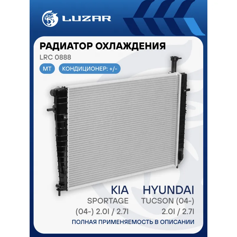 Радиатор охлаждения для автомобилей Tucson/Kia Sportage (04-) 2.0i/2.7i MT (тип Doowon) Характеристики: Артикул: LRc 0888 OEM номера: 25310-2E101, 25310-2E121, 25310-2E100, 25310-2E120 Трансмиссия: MT Кондиционер: +/- Длина сердцевины, мм: 640 Высота сердцевины, мм: 438 Толщина сердцевины, мм: 16 Тип сердцевины: паяная Сопутствующий товар: Электровентиляторы охлаждения: LFK 0881 Сопутствующий товар: Радиаторы кондиционера (конденсеры): LRAC 08E2 Сопутствующий товар: Крышки (пробки) радиатора: LL 1905 Тип конструкции: Dowoon (DCC) Подходит для авто: Kia Sportage II (04-) Hyundai Tucson I (04-) Для проверки применяемости отправьте VIN автомобиля через вкладку "Есть вопросы о товаре?" Комплектация: Радиатор охлаждения Паспорт изделия Гарантия: от 1 года.