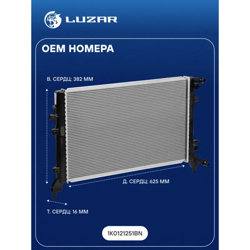 Радиатор охлаждения для автомобилей VW Golf (08-)/Skoda Octavia (04-) (жидк. интеркул.) Характеристики: Артикул: LRc 18BN OEM номера: 1K0121251BN Сопутствующий товар: Элементы для уплотнения соединений: LGS 0032 Трансмиссия: MT/AT Кондиционер: +/- Длина сердцевины, мм: 625 Высота сердцевины, мм: 382 Толщина сердцевины, мм: 16 Тип сердцевины: паяная Материал сердцевины: алюминий Материал бачков: пластик Сопутствующий товар: Электровентиляторы охлаждения: LFc 18K2; LFK 18K2 Сопутствующий товар: Электровентиляторы кондиционера: LFAC 18K0 Сопутствующий товар: Радиаторы кондиционера (конденсеры): LRAC 1811J; LRAC 181D; LRAC 18L3 Сопутствующий товар: Крышки (пробки) расширительного бачка: LL 1835 Подходит для авто: Volkswagen Golf VI (08-), Golf Plus (09-), Jetta (05-), Jetta (11-), Golf VI (08-), Passat B6 (05-), Passat B7 (10-) Skoda Octavia A5 (04-), Yeti (09-), Superb II (08-), Yeti (09-) Audi A3 (03-) Для проверки применяемости отправьте VIN автомобиля через вкладку "Есть вопросы о товаре?" Комплектация: Радиатор охлаждения Паспорт изделия Гарантия: от 1 года.