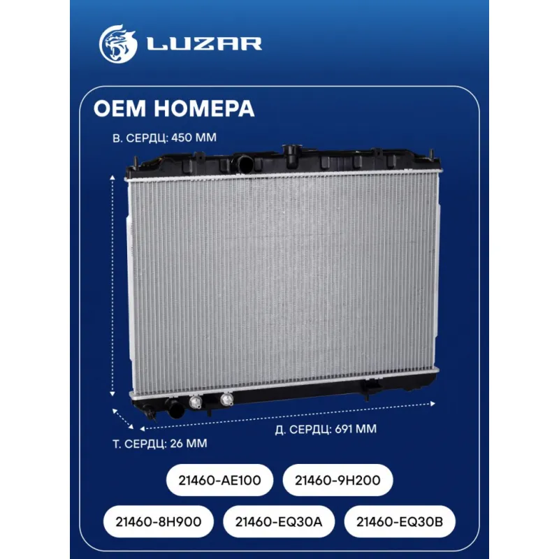 Радиатор охлаждения для автомобилей X-Trail T30 (01-) AT Характеристики: Артикул: LRc 141H8 OEM номера: 21460-8H900, 21460-EQ30A, 21460-EQ30B, 21460-AE100, 21460-9H200 Трансмиссия: AT Кондиционер: +/- Длина сердцевины, мм: 691 Высота сердцевины, мм: 450 Толщина сердцевины, мм: 26 Сопутствующий товар: Электровентиляторы охлаждения: LFK 1408 Сопутствующий товар: Радиаторы кондиционера (конденсеры): LRAC 14H8 Сопутствующий товар: Крышки (пробки) радиатора: LL 0809 Подходит для авто: Nissan X-Trail T30 (01-) Для проверки применяемости отправьте VIN автомобиля через вкладку "Есть вопросы о товаре?" Комплектация: Радиатор охлаждения Гарантийный талон Гарантия: от 1 года.